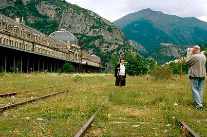 "The Pyrenees do not longer exist", proudly called King Alfonso XII. of Spain at the inauguration, general Primo de Rivera and the president of the French Republic being present. After 70 years of planning and construction work people of the sparse mountain valley hoped for a bit of the luxury built there, intended to attract guests from all over Europe to stay in the hotel of the train station. However already during the time the connection was built the Spanish government refused to adjust the width of their rail tracks according to the European standard, thereby planting the seed for the project to fail. Each passenger had to pass passport controls in the train stations, each bit of luggage customs, goods were shifted by crane from one train to the other. Soon it became apparent that the loss of time in Canfranc caused the connection to become ineconomic for hauliers. Only 8 years after its opening on account of the Spanish civil war the Somport tunnel, cutting through the Pyrenees and connecting France with Spain, became closed. Also during the second world war the connection remained closed. Thereafter again, but not for long, Canfranc became important, yet in 1970 when on the French side the rail bridge of Estanguet collapsed it was the end of the international rail traffic. Today on the Spanish side there is a train connection from Zaragoza to Canfranc and back twice per day.