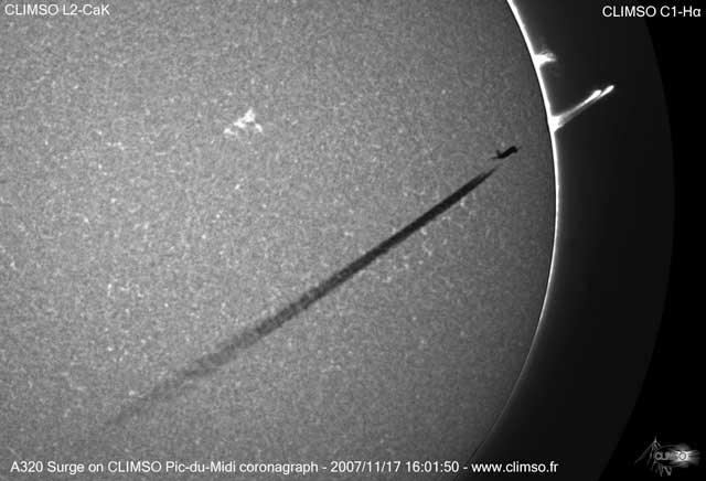 This is a composite shot. With the second image, the jet is off-screen to the right and the thing that looks like a a solar prominence is actually an artifact from the turbulence of the jet's contrail.